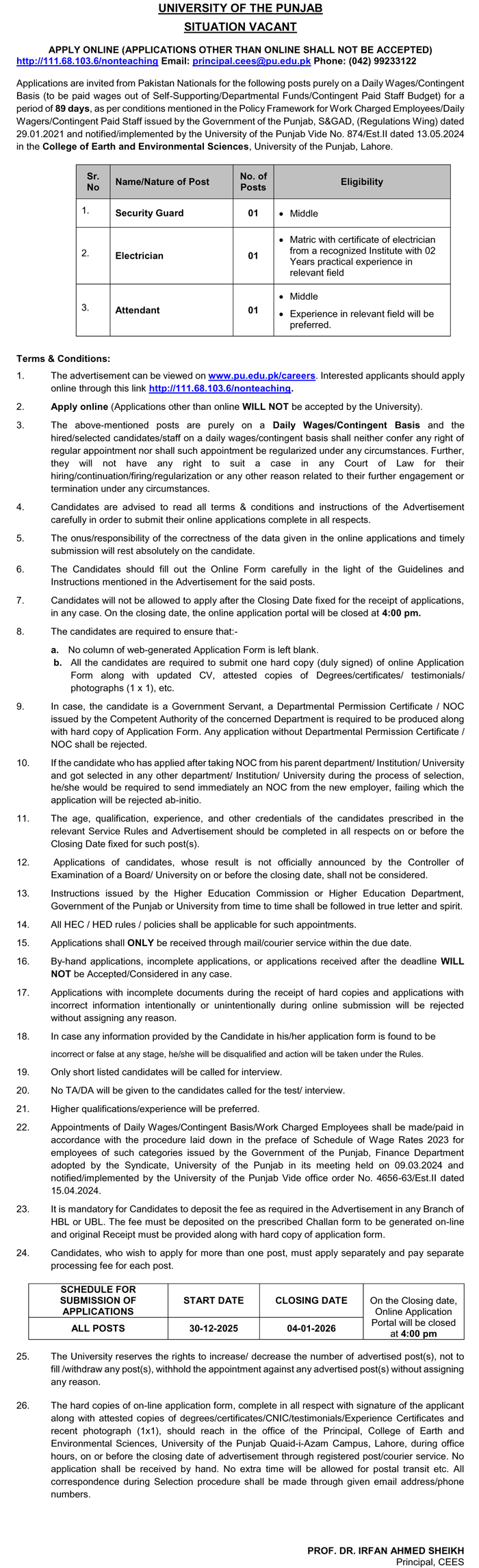 Job Type: SITUATION VACANT - Security Guard, Electrician and Attendant (posts purely on a Daily Wages / Contingent Basis) No. of Posts: Department: College of Earth and Environmental Sciences