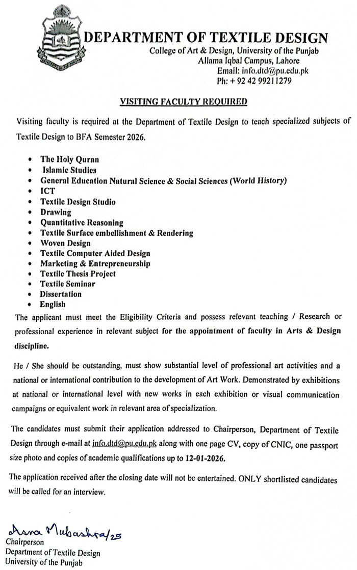 Job Type: Visiting Faculty Required for Spring 2026 (Department of Textile Design) No. of Posts: Department: Department of Textile Design