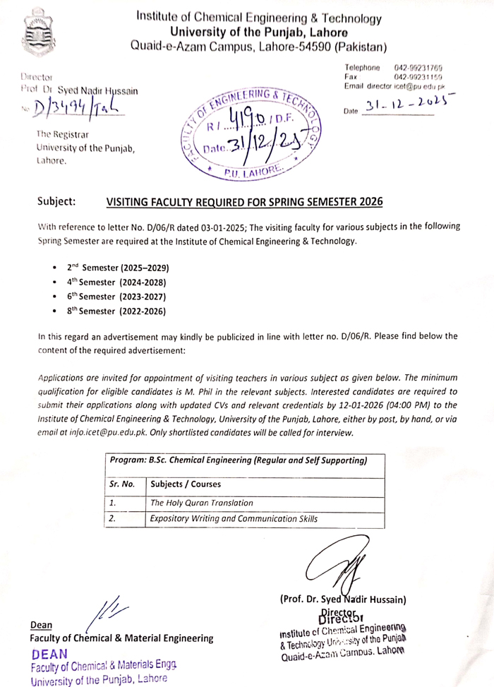 Job Type: Visiting Faculty Required for Spring 2026 (Institute of Chemical Engineering & Technology) No. of Posts: Department: Institute of Chemical Engineering & Technology