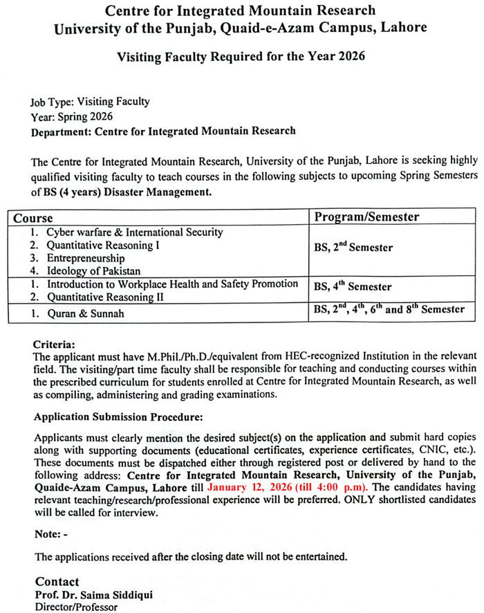 Job Type: Visiting Faculty Required for Spring 2026 (Centre For Integrated Mountain Research) No. of Posts: Department: Centre For Integrated Mountain Research (CIMR)