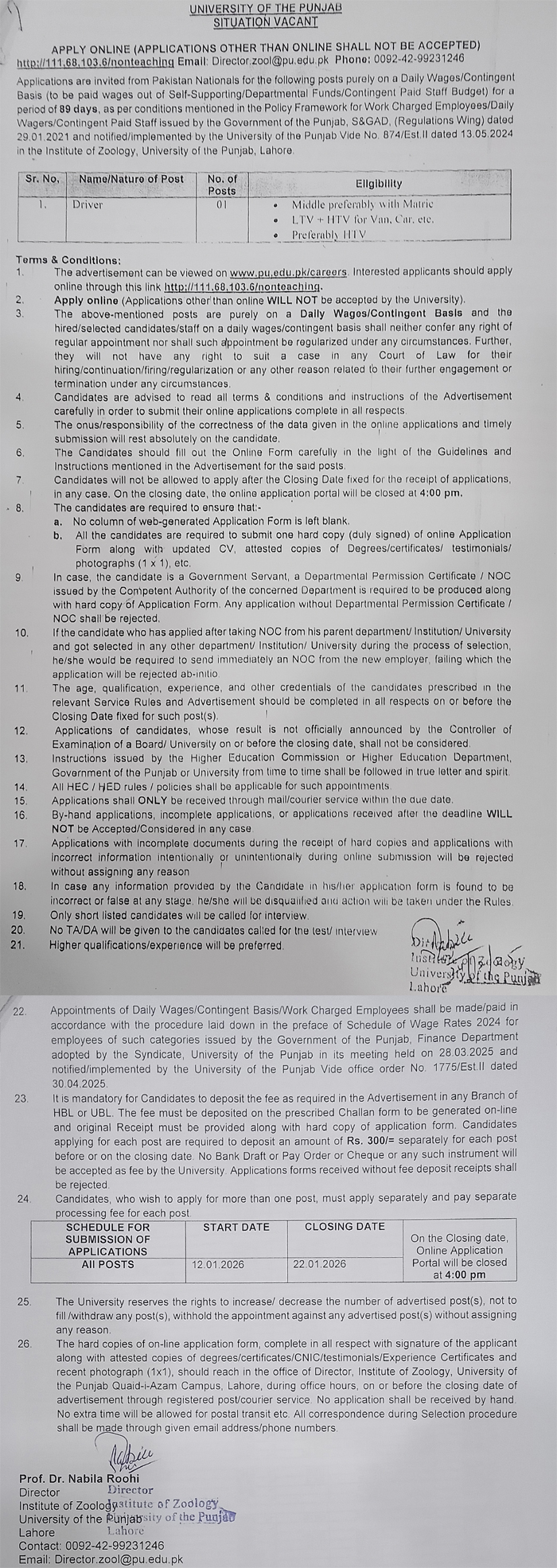 Careers SITUATION VACANT - Driver (posts purely on a Daily Wages / Contingent Basis) Job Type: SITUATION VACANT - Driver (posts purely on a Daily Wages / Contingent Basis)No. of Posts: Department: Institute of Zoology Apply online (applications other than online shall not be accepted) Click here to Apply Online http://111.68.103.6/nonteaching Email: director.zool@pu.edu.pk Phone: 0092-42-99231246 Requirement Criteria Closing Date 22-01-2026 Contact Back to Careers
