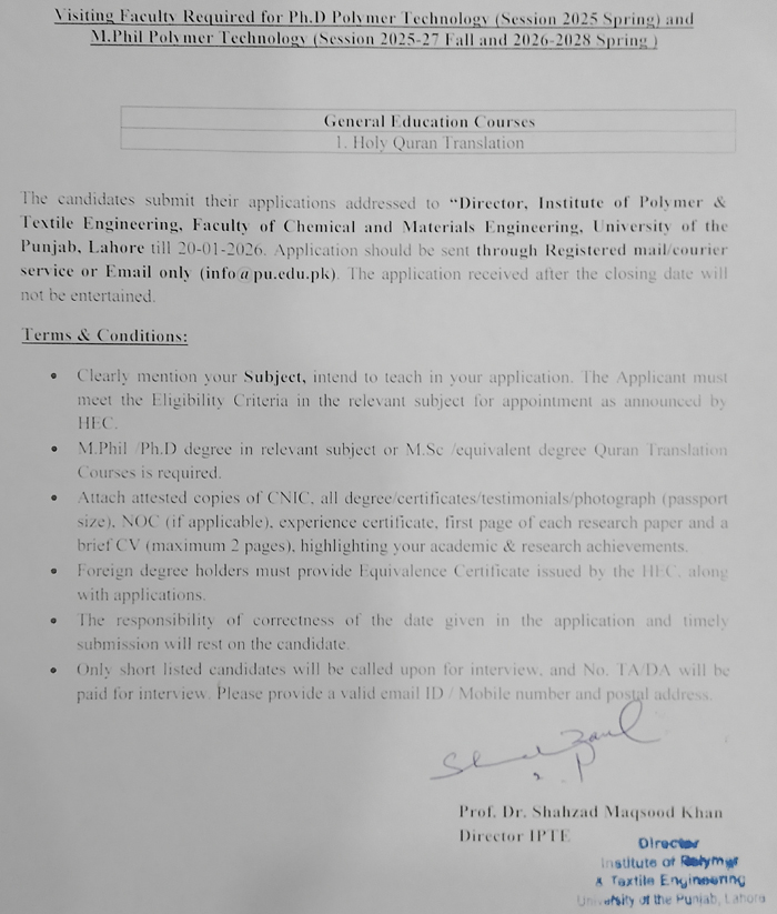 Job Type: Visiting Faculty Required (Institute of Polymer & Textile Engineering) No. of Posts: Department: Institute of Polymer & Textile Engineering