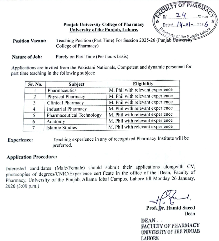 Job Type: Teaching Position (Part Time) for Session 2025-26 (Punjab University College of Pharmacy) No. of Posts: Department:Punjab University College of Pharmacy