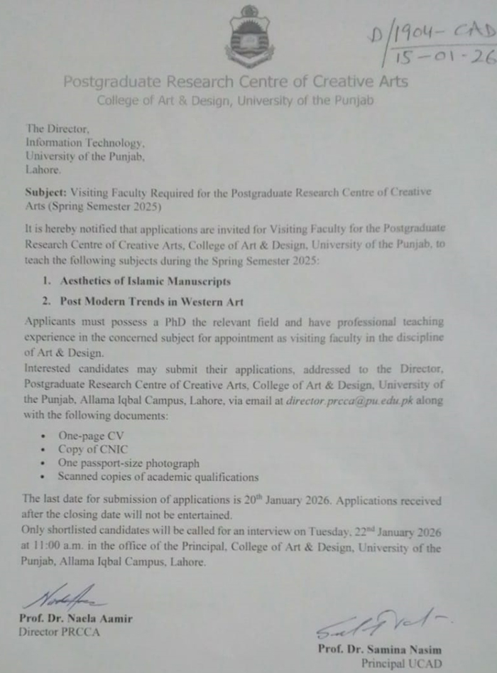 | Visiting Faculty Required (Postgraduate Research Centre of Creative Arts) |