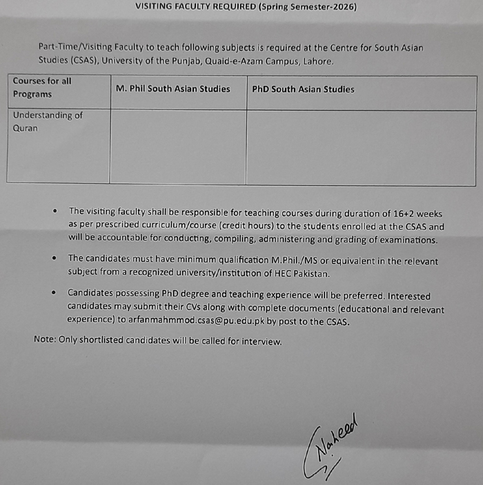 Job Type: Visiting Faculty Required for Spring 2026 (Centre for South Asian Studies) No. of Posts: Department: Centre for South Asian Studies