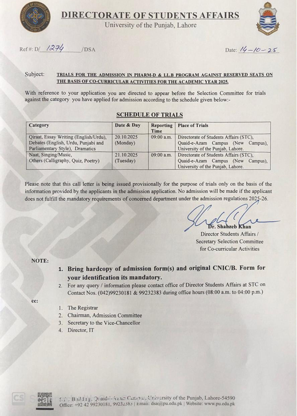 Rescheduled Trials for Admission to Pharm-D and LL.B Programs on the Basis of Co-Curricular Activities Year 2025