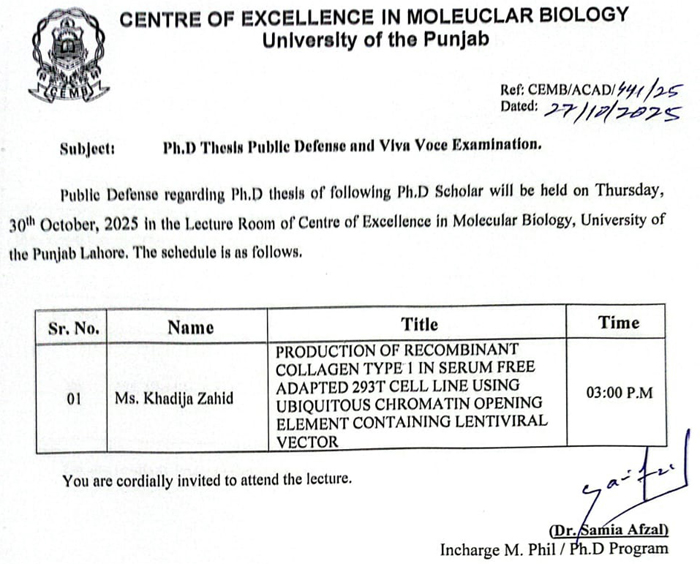 Ph.D. Public Defense and Viva Voce Examination of Ms. Khadija Zahid